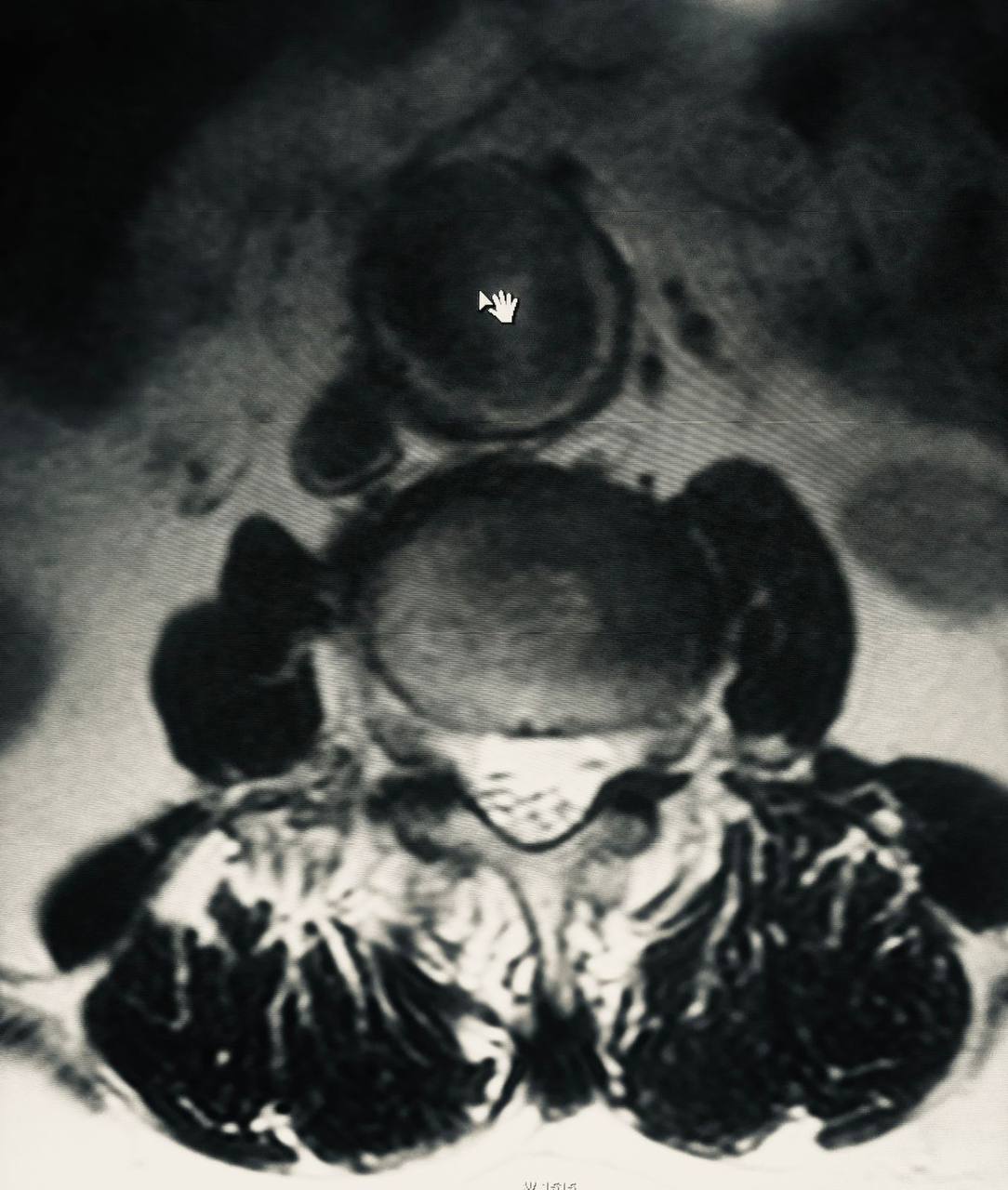 На прием обратился пациент (74 года) с жалобами на боли в спине. Для диагностики провели МРТ пояснично-крестцового отдела позвоночника, на котором и выявили крупную аневризму брюшного отдела аорты.